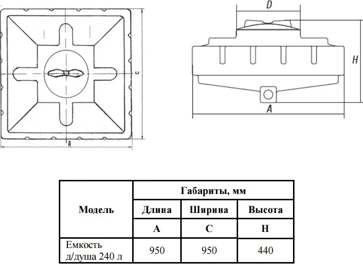 Характеристики товара Бак для душа без выхода под ТЭН Aquatech 240л 950x950x440мм черный DCH(A)440-00240D-S