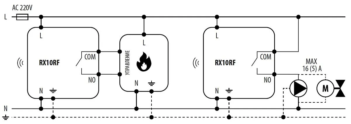 ✔ RX10RF сконфигурированное как RX2 используется для управления с одного терморегулятора одной зоной отопления