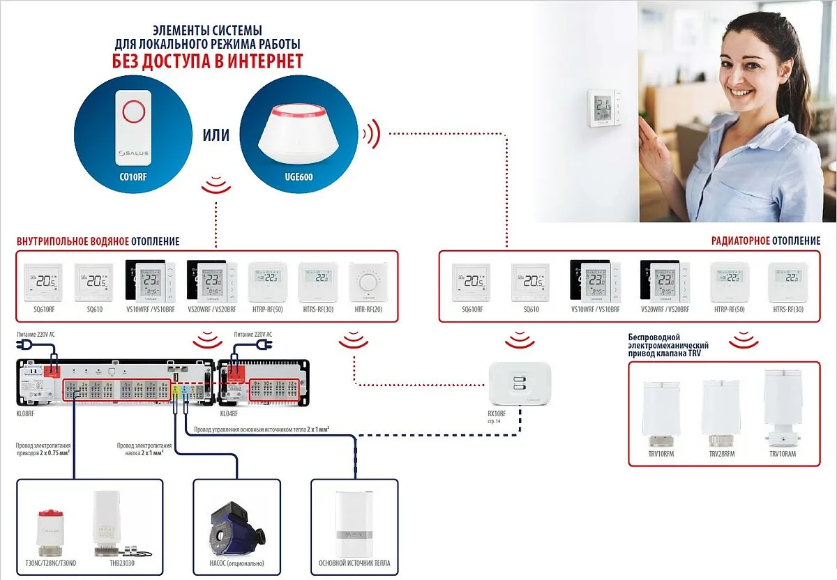 ✔ RX10RF сконфигурированное как RX1 служит для управления основным источником отопления в системе (котлом) в случае, когда в системе более одного центра коммутации, либо когда для управления используются беспроводные приводы клапанов TRV, либо когда в системе присутствует и центр коммутации и TRV. Выключает котел когда все помещения не требуют отопления и включает котел, когда хотя бы одно из помещений требует отопления