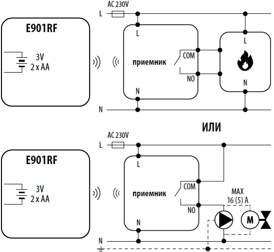 E901RF – это комнатный регулятор открытого монтажа, используемый для беспроводного управления недельными настройками нагревательных и охлаждающих приборов и систем. Его функция заключается в поддержании комфортных условий в помещении в соответствии с графиком работы или установленной пользователем постоянной температуры. Регулятор сопряжен с приемником на заводе. Приемник подключается, например, к котлу.