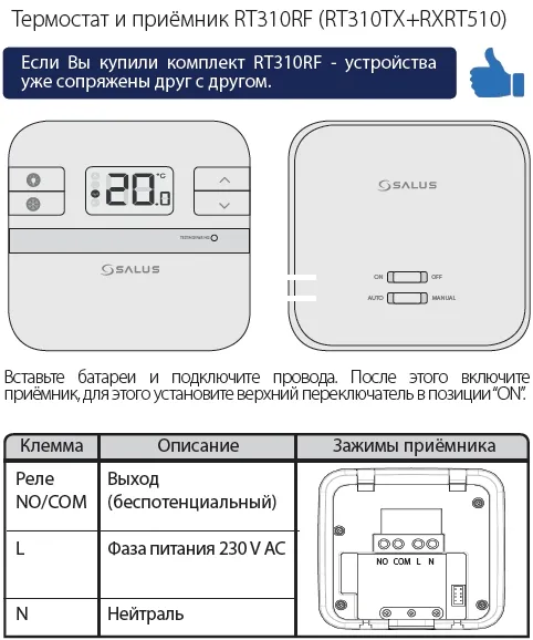Беспроводной электронный непрограммируемый накладной терморегулятор Исполнительное устройство RXRT510, имеющее беспотенциальное выходное реле NO/COM, позволяет управлять котлом с входом для внешнего терморегулятора или любым электрическим прибором.