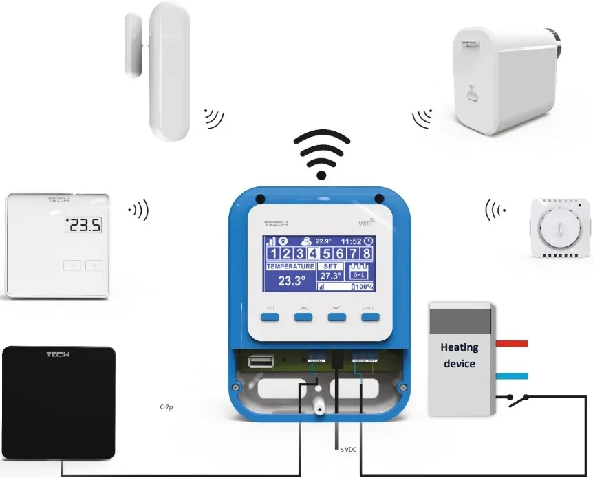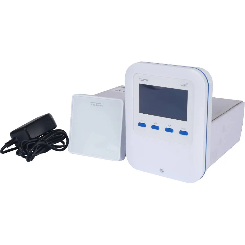 Беспроводной комнатный контроллер WiFi 8S предназначен для управления температурой воздуха в помещении, посредством беспроводных термоэлектрических приводов TECH STT-868. Контроллер WiFi 8S может управлять температурой воздуха в 8-ми различных помещениях, в каждом из которых может быть установлено до 6-ти термоэлектрических приводов. В контроллере WiFi 8S устанавливается необходимая температура для каждого из восьми контролируемых помещений. Датчики, смонтированные в каждой комнате, измеряют температуру и передают информацию на контроллер. В зависимости от заданной программы, контроллер дает команду радиоуправляемым приводам TECH STT-868 (монтируются на радиатор), на открытие или закрытие контура. Таким образом, увеличивается или уменьшается расход проходящего через радиатор теплоносителя. Кроме управления термоэлектрическими приводами, контроллер также может управлять и источником тепла (котлом): при достижении заданной температуры во всех помещениях, контроллер с помощью «сухого контакта» отключает котел. Контроллер позволяет контролировать работу системы отопления через интернет. Для этого необходимо зайти на сайт
