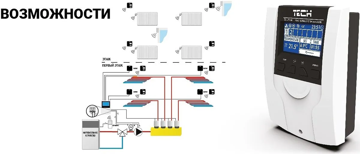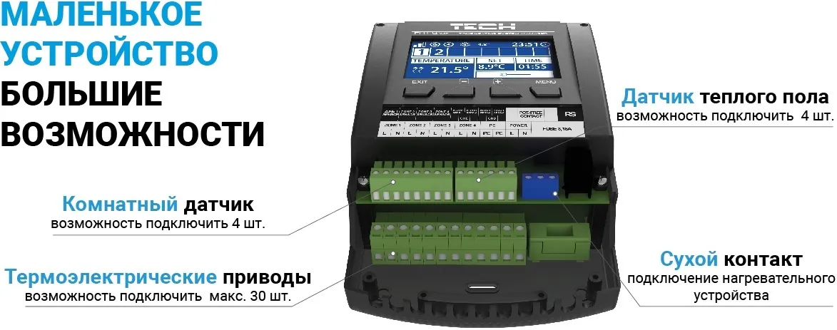 Монтажная планка TECH L-4 WiFi имеет 4 выхода с нагрузкой 0,3A (~66W) для управления термоэлектрическими приводами (питание 230V). Так же к каждой из 8-ми зон можно подключить 6 беспроводных электрических приводов STT-868 или STT-869 и 6 датчиков открытия окна C-2.