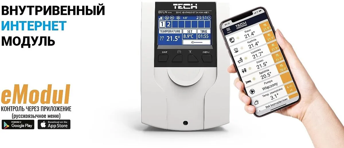 Контроллером TECH L-4 WiFi можно управлять через Интернет, как с компьютера (веб-интерфейс eModul), так и со смартфона через мобильное приложение eModul. Скачать приложение можно в Google Play и App Store.