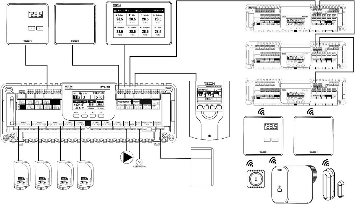 Благодаря расширению системы до 4-х планок ST-L-9r, максимальное количество составляет 32 зоны, которые мы можем контролировать. Связь между основными устройствами а дополнительными является проводной (требуется 4-жильной кабель).