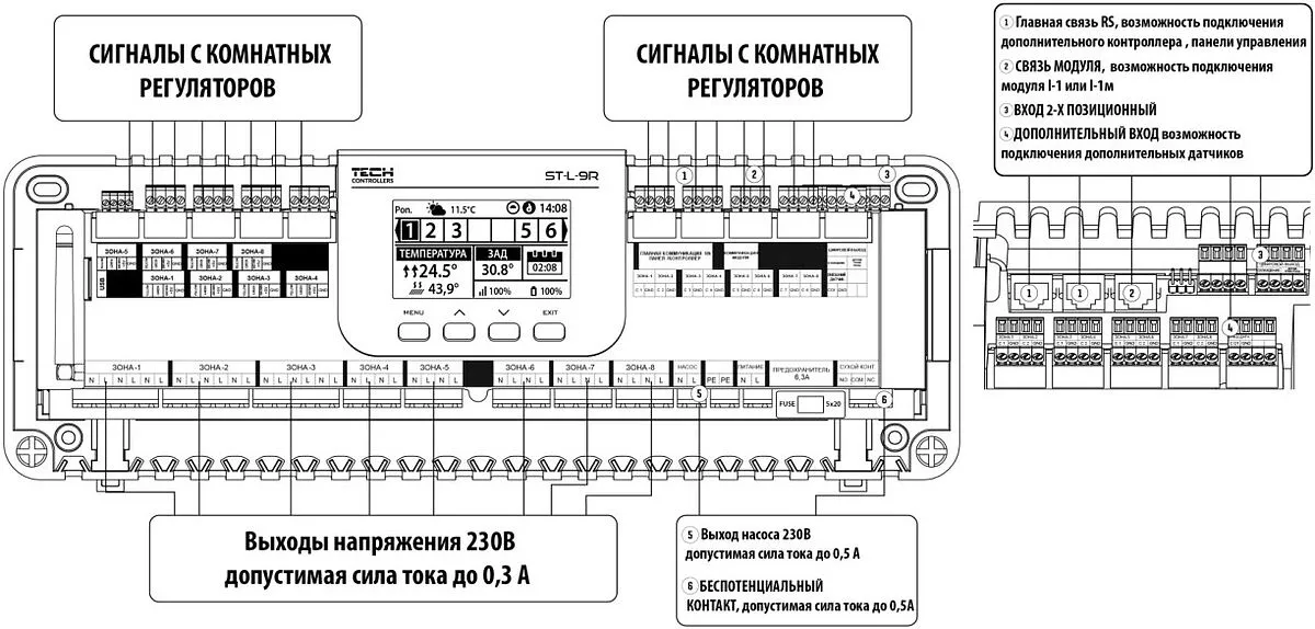 Проводной контроллер для управления термоэлектрическими приводами, предназначенный контролировать температуру теплого пола. Планка ST-L-9r используется для управления термоэлектрическими приводами, установленными на клапанах. В смешанной системе контролер также управляет сервоприводами STT868 или STT-869.