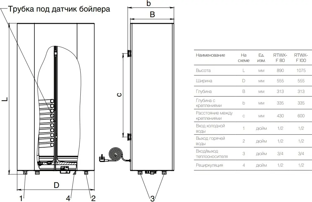 Характеристики товара Бойлер комбинированного нагрева Royal Thermo AQUATEC INOX-F 100 (24 кВт) RTWX-F 100.1