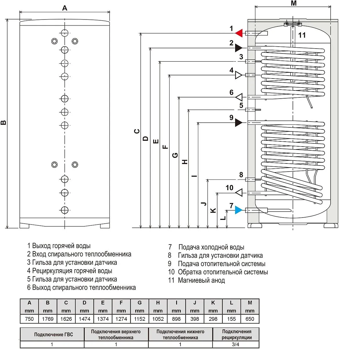 Производительность горячей воды от теплообменника (Δt = 30°С)2076 л/час