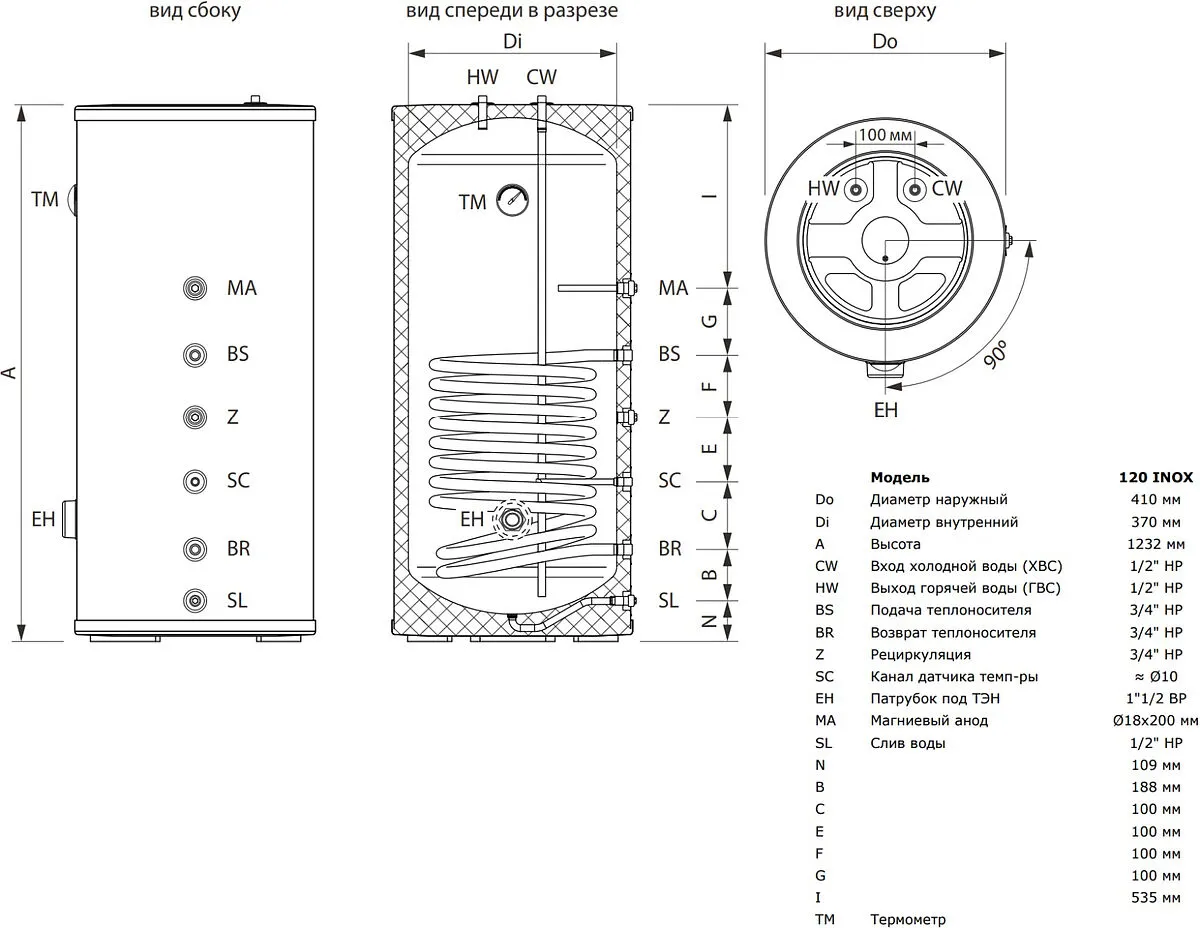 Характеристики товара Бойлер косвенного нагрева с возможностью установки ТЭНа Termica AMET 120 INOX (23 кВт) 85112012