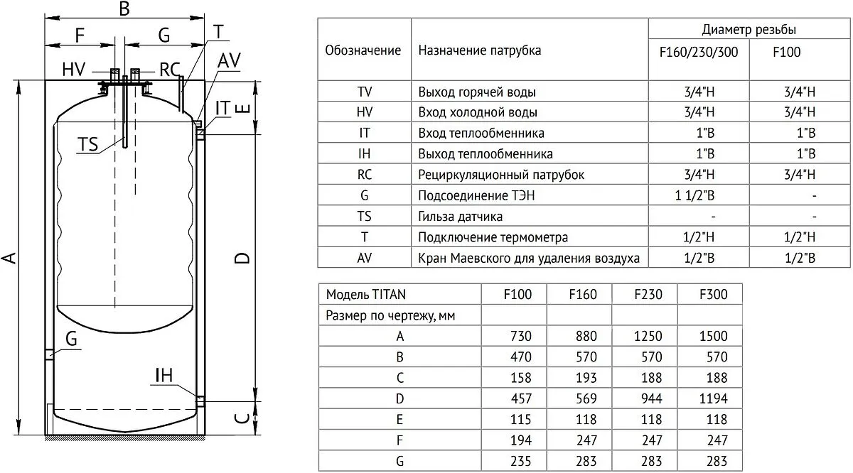 Характеристики товара Бойлер косвенного нагрева с возможностью установки ТЭНа Uni-fitt TITAN F 230 (39 кВт) 804F1023