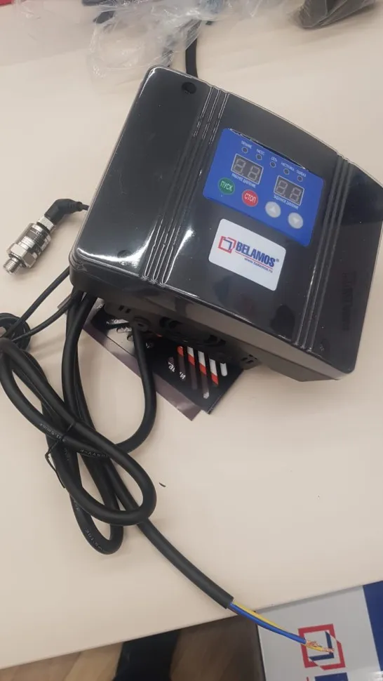 Основное преимущество частотных преобразователей Belamos - простота настройки. Для автоматической работы насоса необходимо задать только требуемое давление в системе. Так же в комплект входит датчик давления.