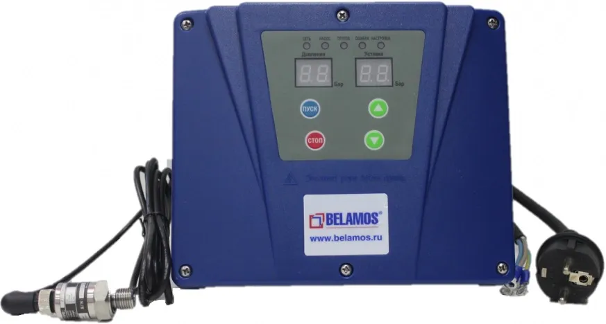 Основное преимущество частотных преобразователей Belamos - простота настройки. Для автоматической работы насоса необходимо задать только требуемое давление в системе. Так же в комплект входит датчик давления.