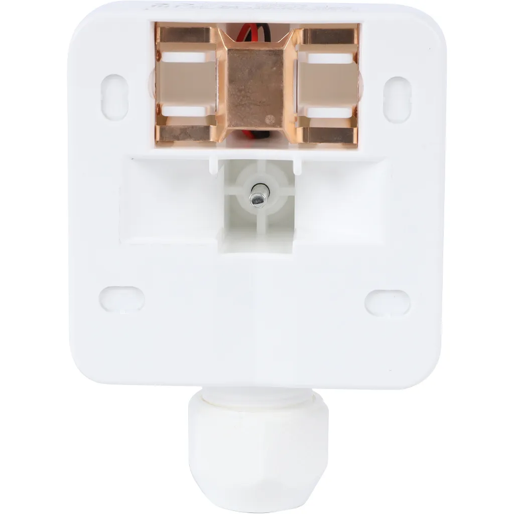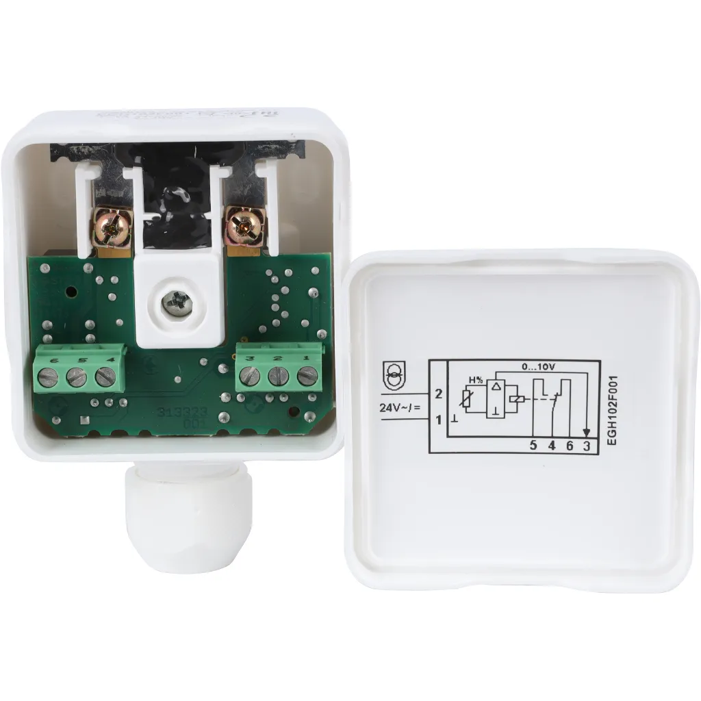 Корпус из негорючего термопласта с сенсором регулирования влажности воздуха по методу точки росы.