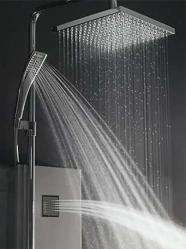 КОМПЛЕКТАЦИЯдушевая лейка, ручной душ, полочка, термостат, шланг для душа, держатель для душа