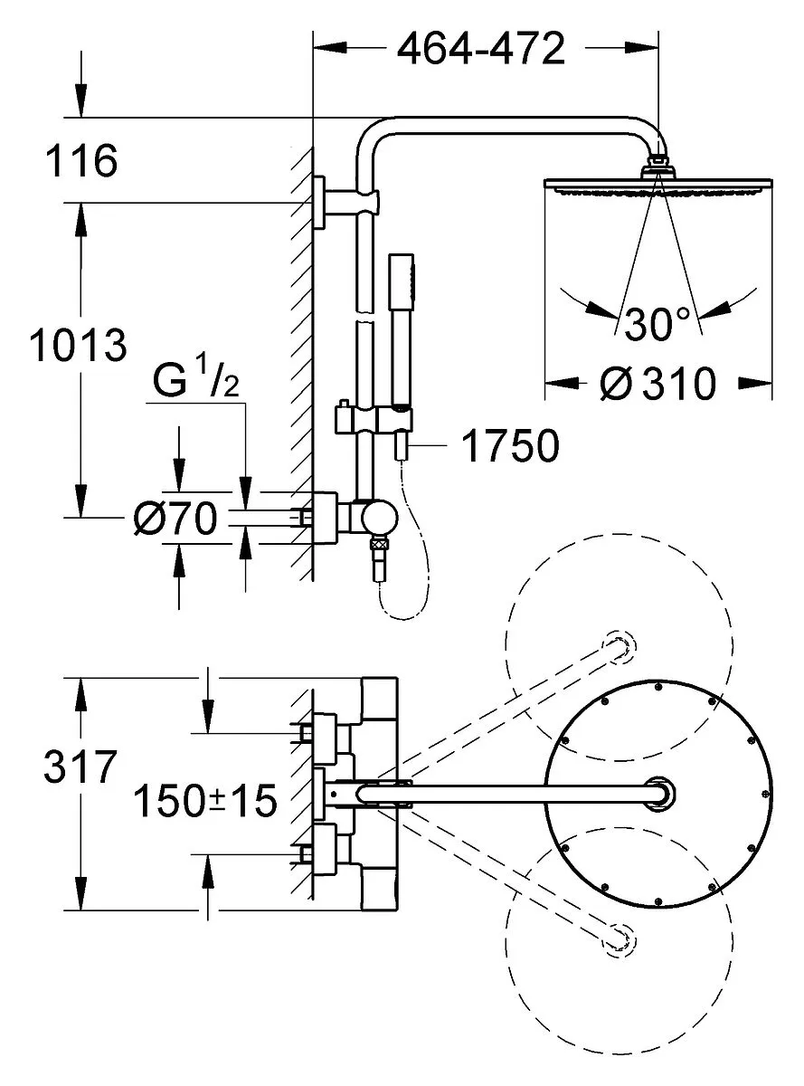 Угол поворота верхнего душа15 °
