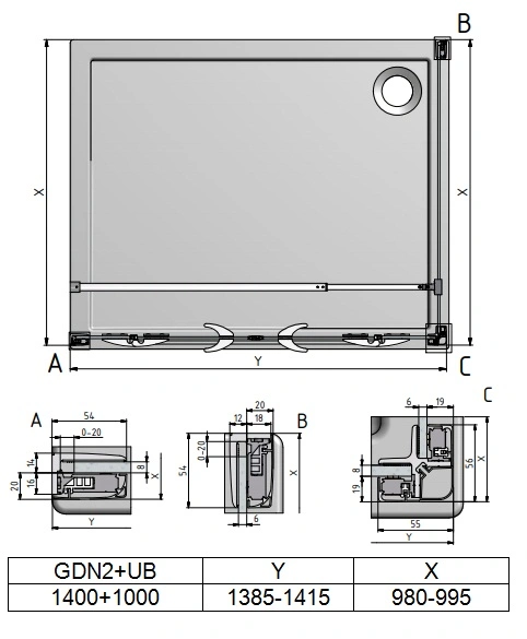 Двустворчатая душевая дверь  в нишу  комбинации со сплошной стенкой UB