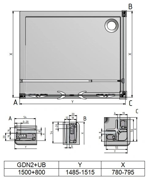 Двустворчатая душевая дверь  в нишу  комбинации со сплошной стенкой UB