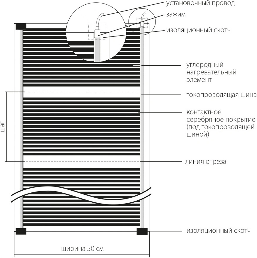 КОМПЛЕКТАЦИЯнагревательная пленка, комплект проводов, контактные зажимы, инструкция, гарантийный талон