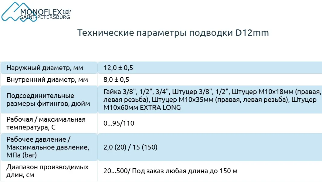 Характеристики товара Гибкая подводка для смесителя Monoflex Standart SS 12мм М-10 longer 0.6м x ½"в x М10x1 L100мм Н02509