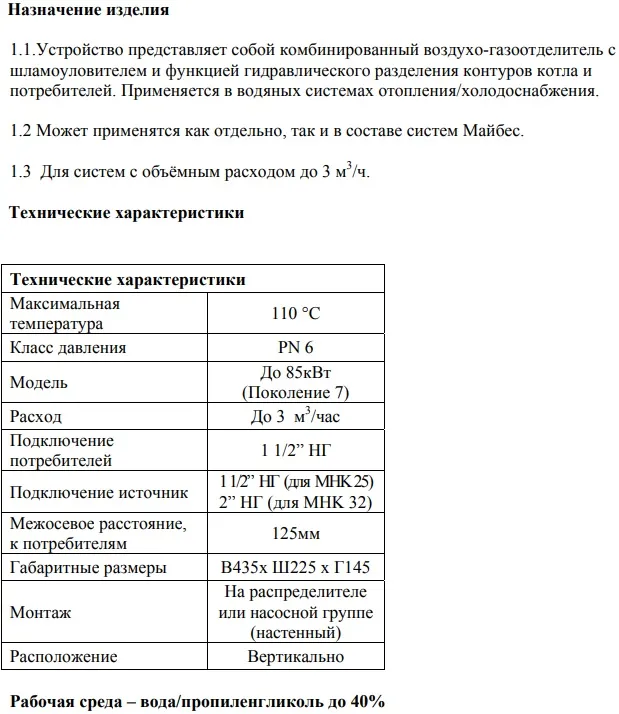 Характеристики товара Гидрострелка 2 м³/час до 60 кВт 1½"нг x 1½"нг Meibes M66391.21RU