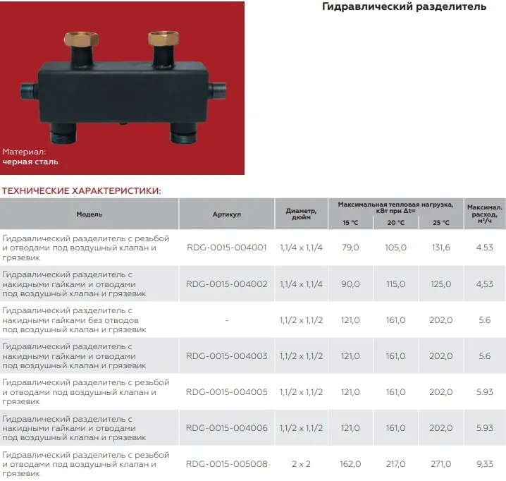 Характеристики товара Гидрострелка 4.53 м³/час до 125 кВт 1¼"н x 1¼"нг Rommer RDG-0015-004002