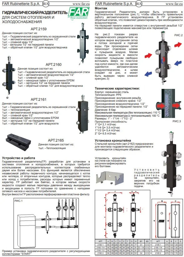 Характеристики товара Гидрострелка 8,5 м³/час до 150 кВт 2"нг x 2"нг Far FA 2160 2