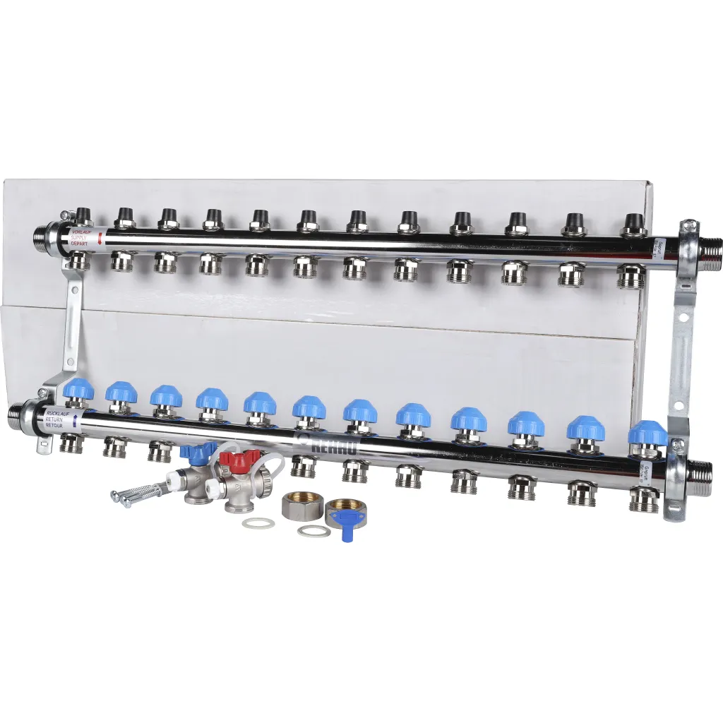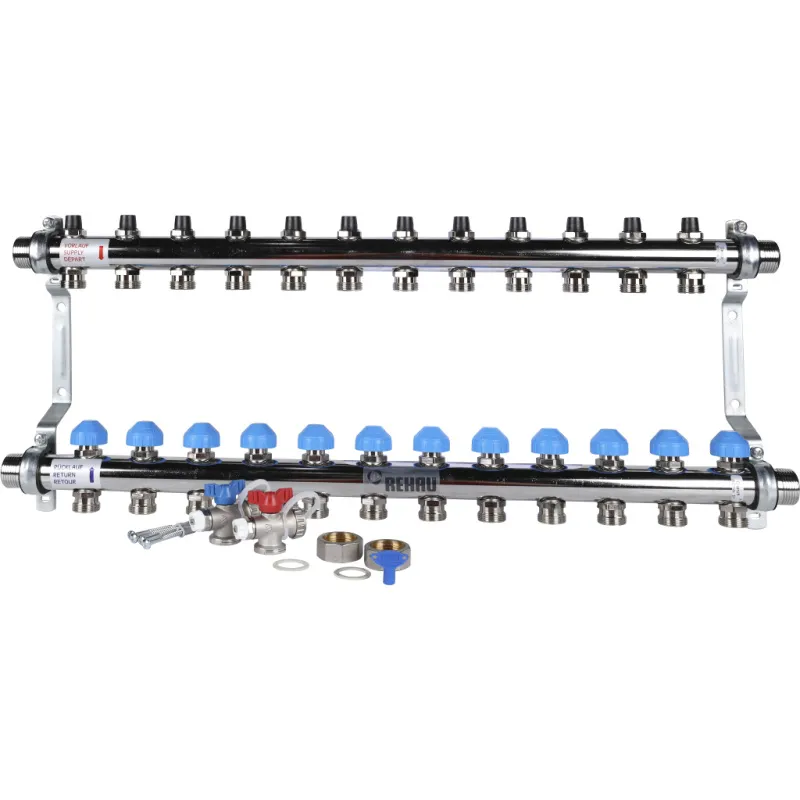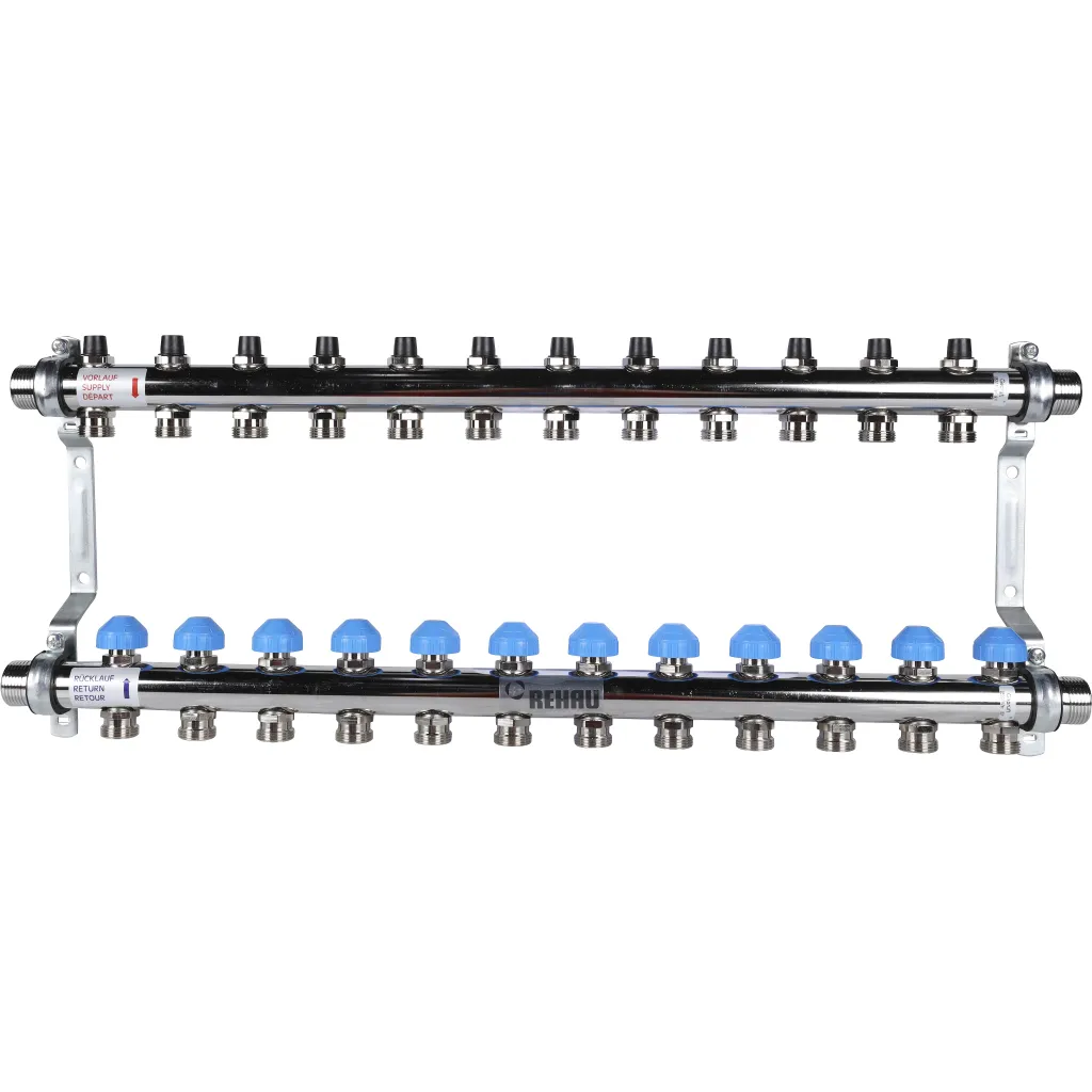 Характеристики товара Группа коллекторная без расходомеров 12 отводов 1"н/н x ¾"ек Rehau HKV 12181211001