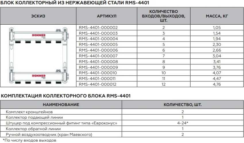 Характеристики товара Группа коллекторная распределительная 8 отводов 1"в/в x ¾"ек Rommer RMS-4401-000008
