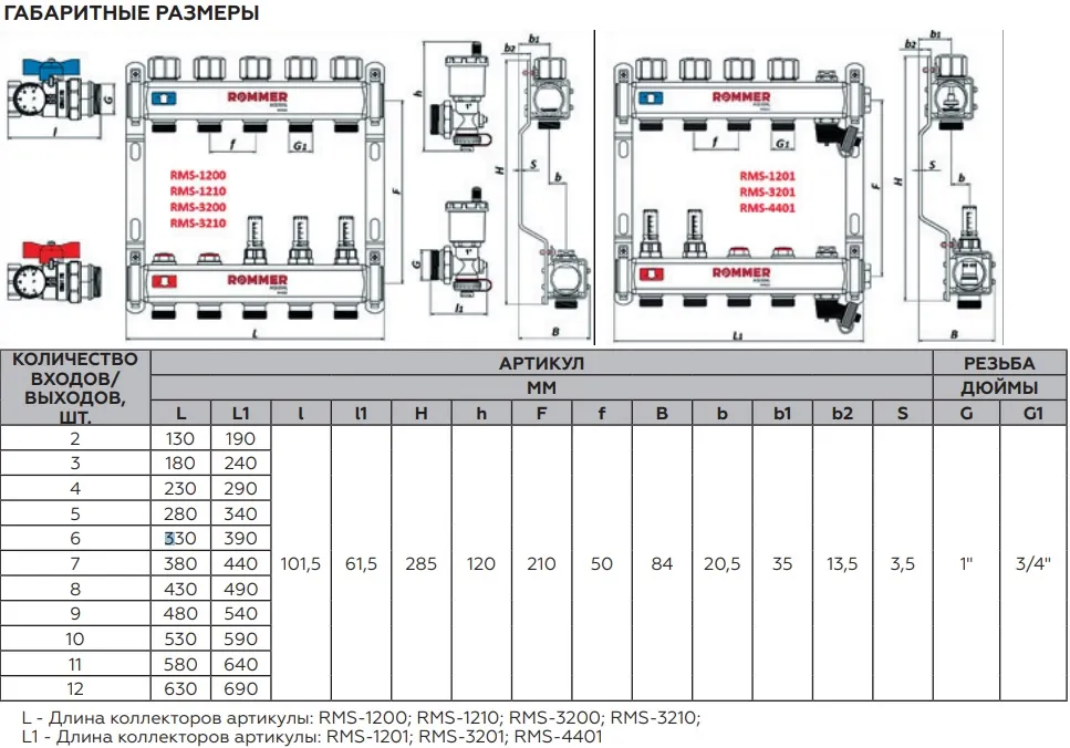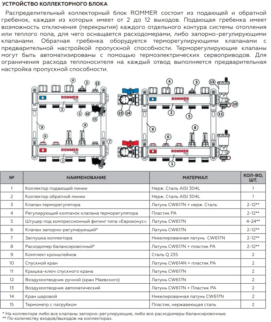 Характеристики товара Группа коллекторная с расходомерами 11 отводов 1"в/в x ¾"ек Rommer RMS-1201-000011