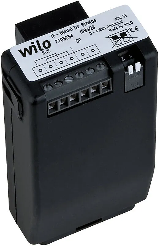 Вставной модуль дооснащения IF-Modul Stratos DP для типов насосов Wilo-Stratos/Stratos-Z/Stratos-D. Две двойные клеммы для промежуточного подключения интерфейса шины. Управление сдвоенными насосами с возможностью передачи данных (в зависимости от времени, нагрузки и при неисправности) Кабель электропитания длиной 0,7 м (2 × 2-жильный, попарно экранированный) включен в комплект поставки).