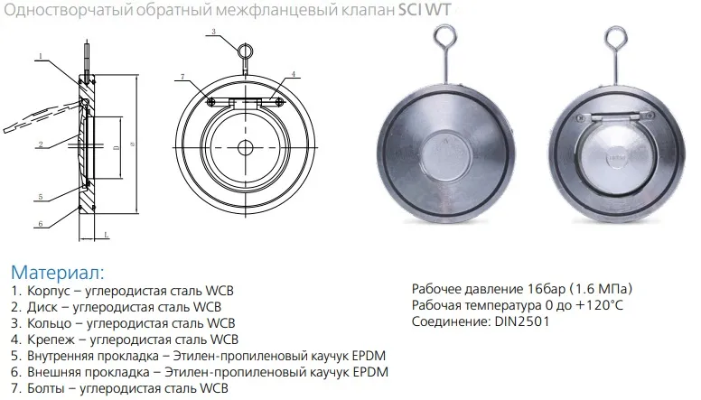 Характеристики товара Клапан обратный поворотный одностворчатый межфланцевый Ду100 Ру16 Water Technics SCI WT SKL100701100