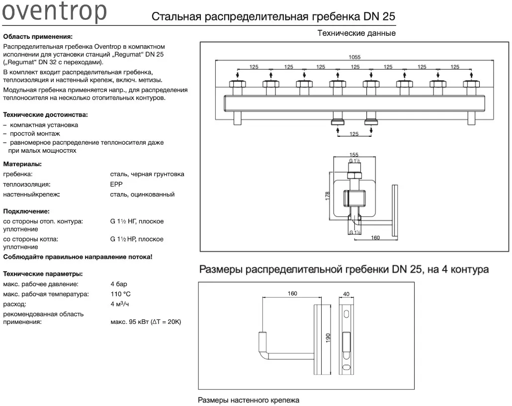 Характеристики товара Коллектор распределительный 4 контура 1½"н x 1½"нг Oventrop Regumat DN 25 1351584