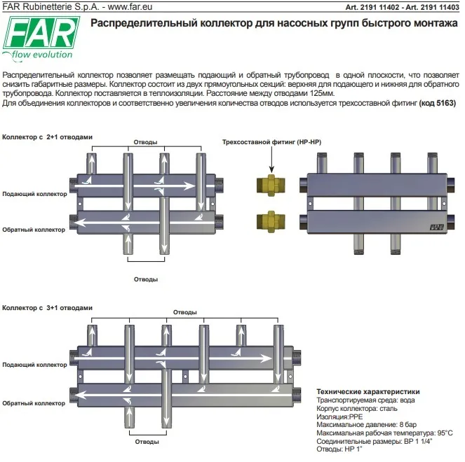 Характеристики товара Коллектор распределительный 4 контура 1¼"в x 1"н Far FK 2191 11403