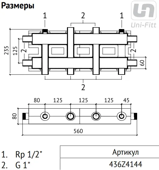 Характеристики товара Коллектор распределительный 4 контура 1"н x 1"н Uni-fitt 436Z4144