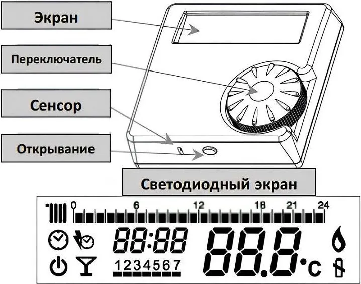 Комнатный термостат типа «ON/OF», проводной, с недельным программированием.