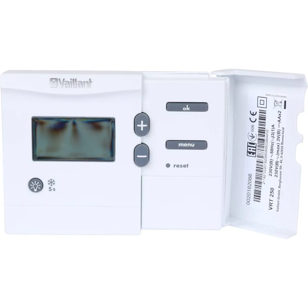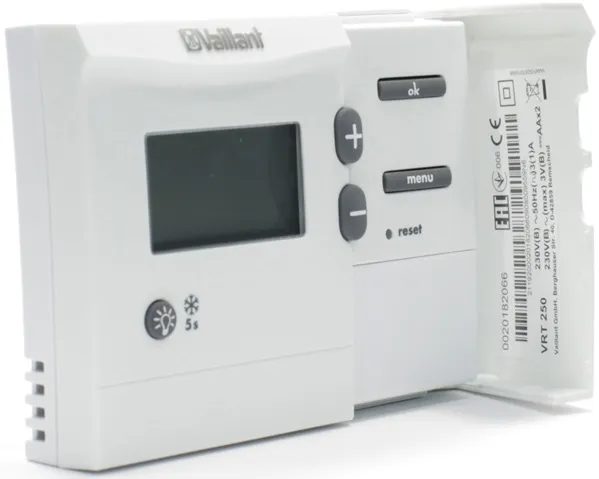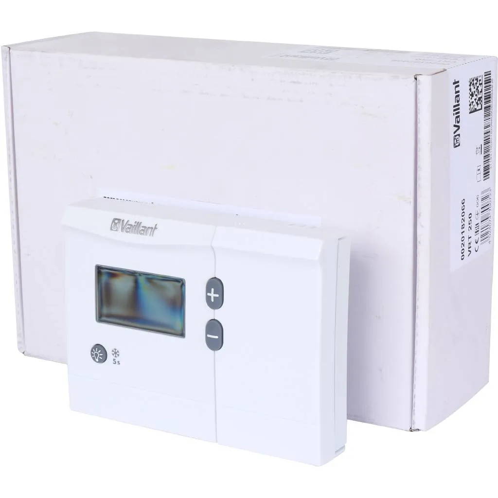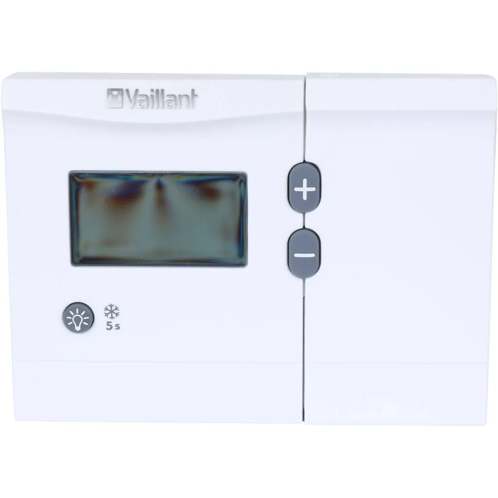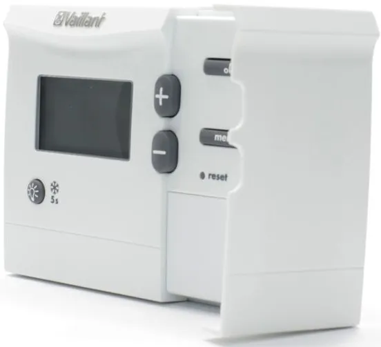 Термостат позволяет пользователю самостоятельно управлять работой котла исходя из температуры в помещении. Котел может располагаться в другой части дома: на другом этаже или даже в подвале. Термостат оснащен функцией, позволяющей запрограммировать температурный режим на неделю, например, снижать температуру в помещении в ночное время и поддерживает особо экономичный режим работы – «Защита от замерзания», активируемый/деактивируемый нажатием одной кнопки. Термостат Vaillant, оснащен графическим дисплеем.