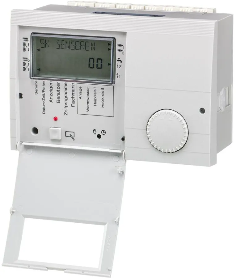 Погодозависимое управление двумя котлами с двухступенчатой горелкой или каскадом из четырех котлов, 1 приводом и 1 насосом смесительного контура, насосом бойлера ГВС (приоритет).