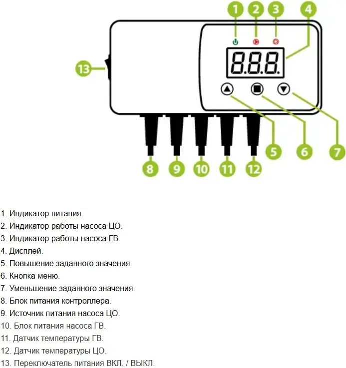 Контроллер включается, когда температура котла превышает установленную пользователем температуру включения насоса ЦО. Насос ГВС работает на основе разницы температур. Насос ГВС включается, когда температура котла превышает температуру бака на заданный пользователем гистерезис. Насос горячей воды работает до тех пор, пока температура котла и бака не сравняется или не будет достигнута заданная температура бака.