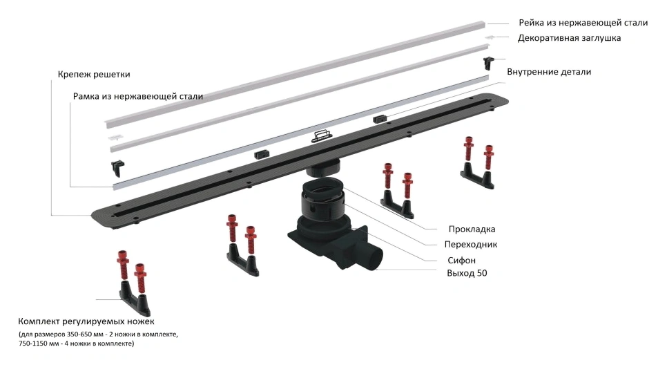 КОМПЛЕКТАЦИЯопоры, прокладка гидроизолирующая, решетка, сифон