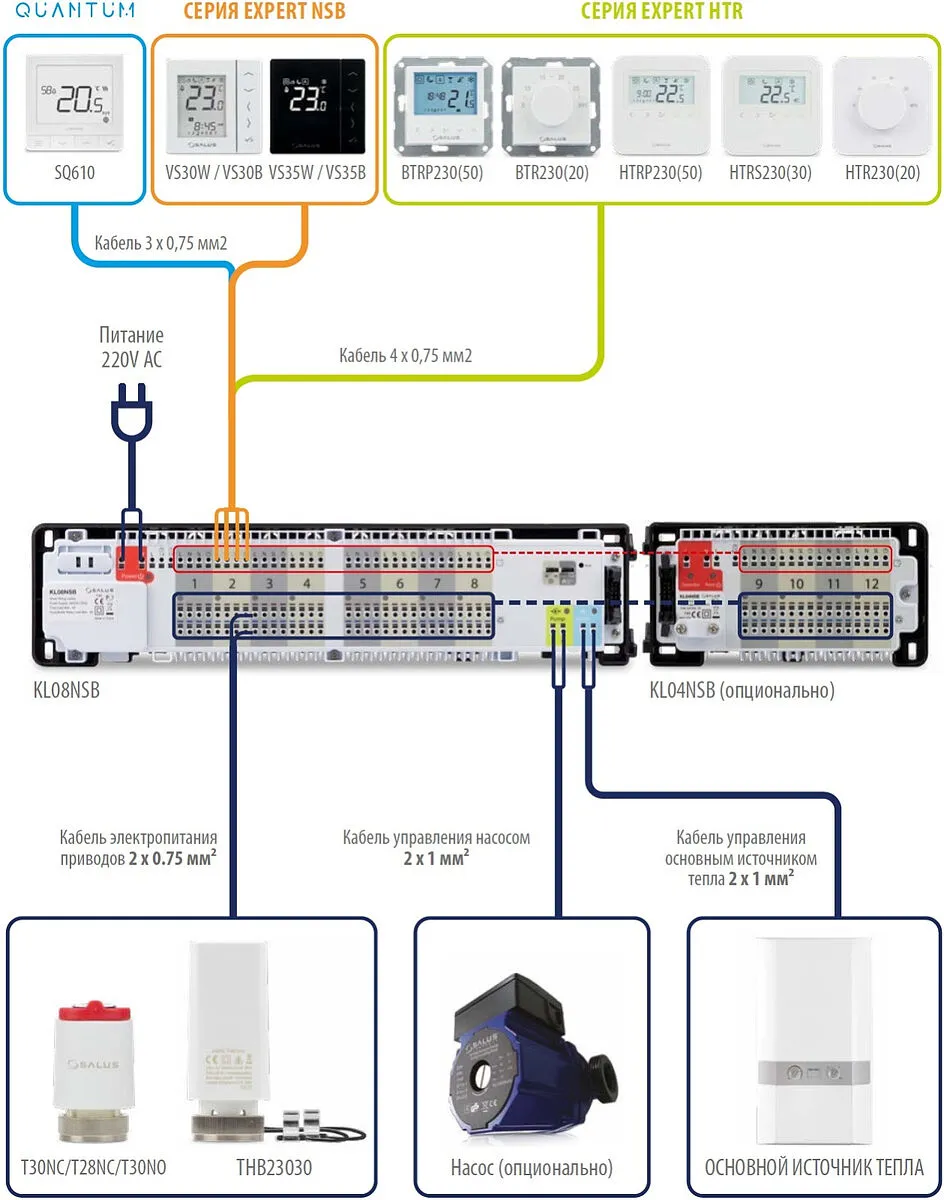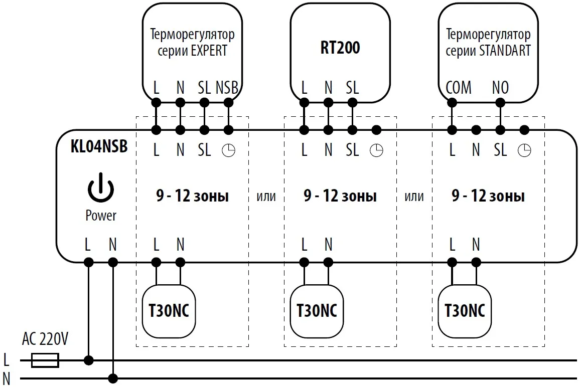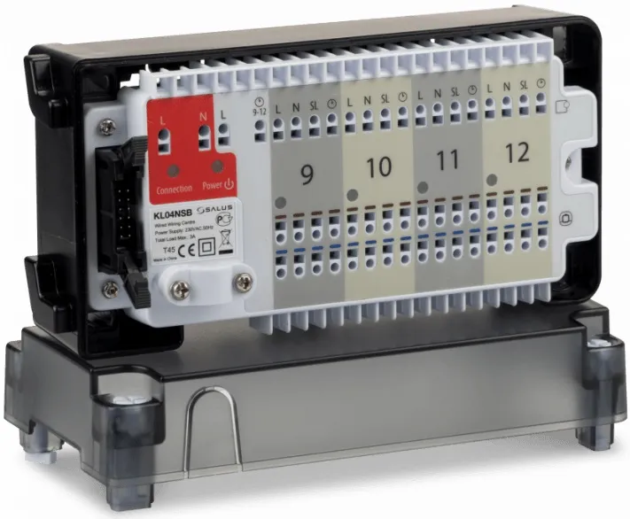 Проводной расширительный модуль на 4 дополнительныe зоны отопления. Может использоваться в составе системы как вместе с центром коммутации KL08NSB, так и самостоятельно, как 4-х зонный центр коммутации.