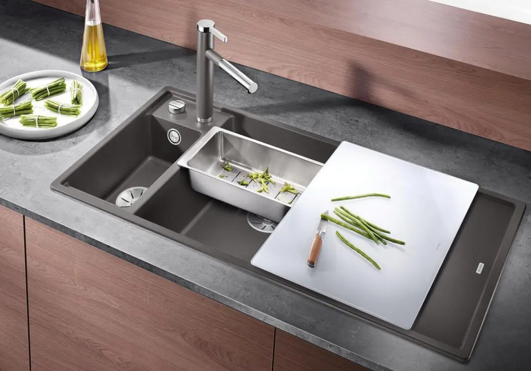 КОМПЛЕКТАЦИЯразделочная доска из белого безопасного стекла, коландер, отводная арматура InFino® с двумя корзинчатыми вентилями 3 ½