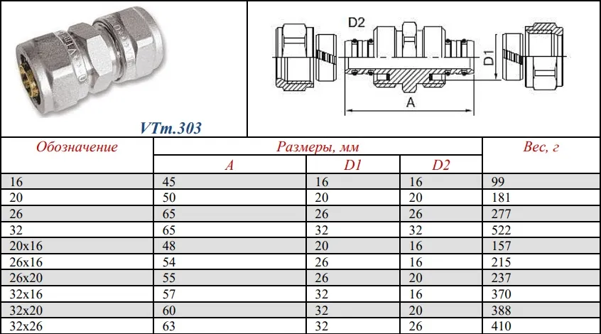 Характеристики товара Муфта компрессионная редукционная 32мм x 16мм Valtec VTm.303.N.003216