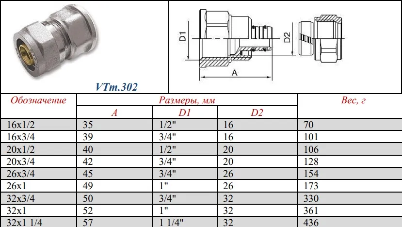 Характеристики товара Муфта компрессионная переходная 20мм x ½"в Valtec VTm.302.N.002004