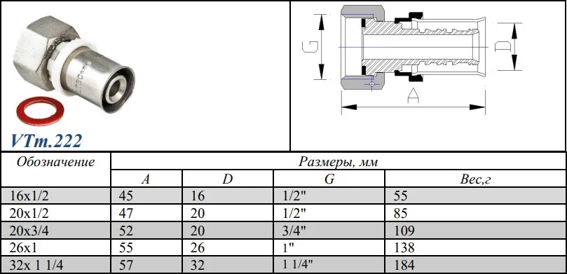 Характеристики товара Муфта пресс с накидной гайкой 20мм x ½"нг Valtec VTm.222.N.002004