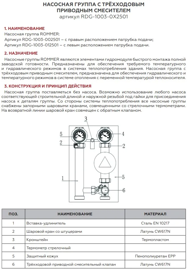 Характеристики товара Насосный модуль с 3-х ходовым смесительным клапаном 1½"н х 1"в Rommer RDG-1003-002501 без насоса
