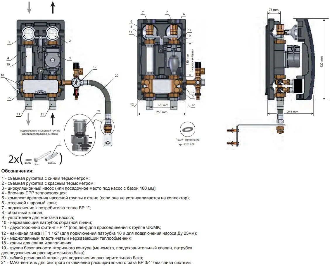 Характеристики товара Насосный модуль с теплообменником 20 пластин 1"н х 1"в Meibes UK M45811.20 с насосом Grundfos UPS 25-60