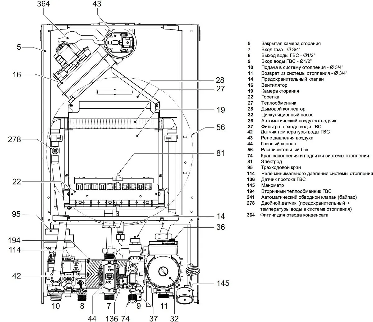 Характеристики товара Настенный газовый котел двухконтурный турбированный 32кВт Ferroli Diva D F32 0DAF7AYA