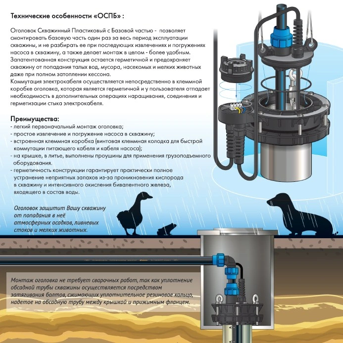 Наличие базовой части в оголовке - это позволяет смонтировать базовую часть один раз за весь период эксплуатации скважины, и не разбирать ее при последующих извлечениях и погружениях насоса в скважину, а также делает монтаж в целом - более удобным. запатентованная конструкция остается герметичной и предохраняет скважину от попадания талых вод, мусора, насекомых и мелких животных даже при полном затоплении кессона.