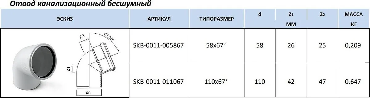 Характеристики товара Отвод внутренний бесшумный D=58мм Угол 67° Stout SKB-0011-005867