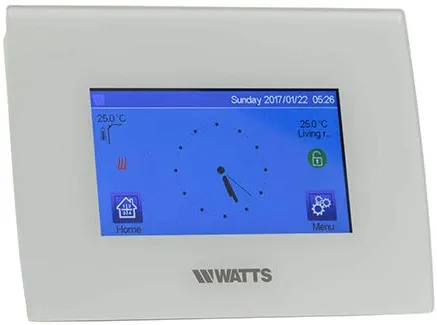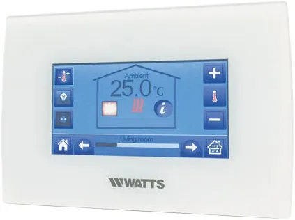 Панель управления с цветным емкостным сенсорным экраном, высококачественный дизайн с отделкой из настоящего стекла, черный цвет корпуса, для централизованного программирования и управления системой умного дома WATTS Vision®. Установка индивидуальных временных программ для максимум 50 беспроводных термостатов отопления/охлаждения, а также для 25 световых и 25 ВКЛ/ВЫКЛ схем с использованием скрытых или поверхностных беспроводные приемники, а также беспроводные розетки. Многоязычное меню оператора.